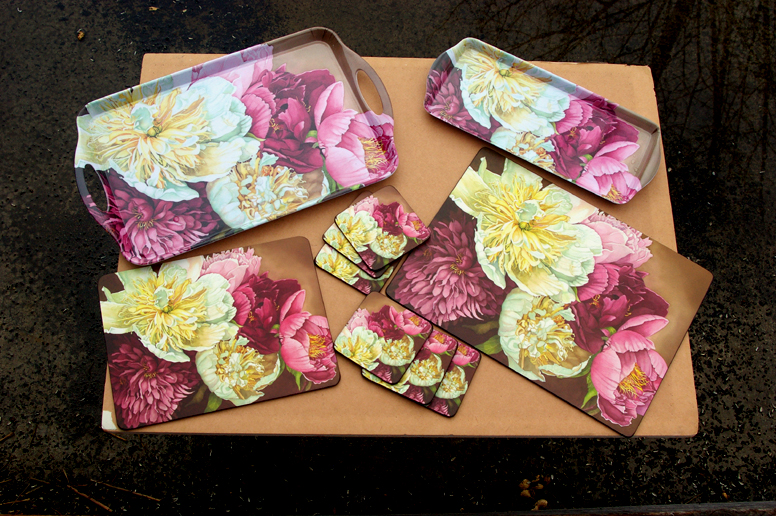 I have been waiting to show you these...it just took a year for the samples to come out and actually receive a set to see! These are being made by Lifesyles of the UK. It is a large tray and small thin tray, and then small and large placemats and coasters with a cork bottom. They really are nice! But I am not sure they are available in the US! ha!! I guess I have to wait and see. They have a website but this pattern is not up yet it is http://www.life-style.co.uk/ and hopefully I will hear if anyone in the US will handle them.