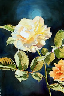 I am feeling a little better and decided to try something different with the watercolor of the yellow rose...which is scarey as I was liking the rose very much. I decided to try a moon since I write poetry about Mr Moon so often. I think this is maybe showing up a little more blue than it really is but I left it as I am wondering if another glaze of blue is what I need! The title for this I think is going to be, Once In a Blue Moon...and I hope that I do not ruin it. ha! Some of you know my history of painting while sick. ha!